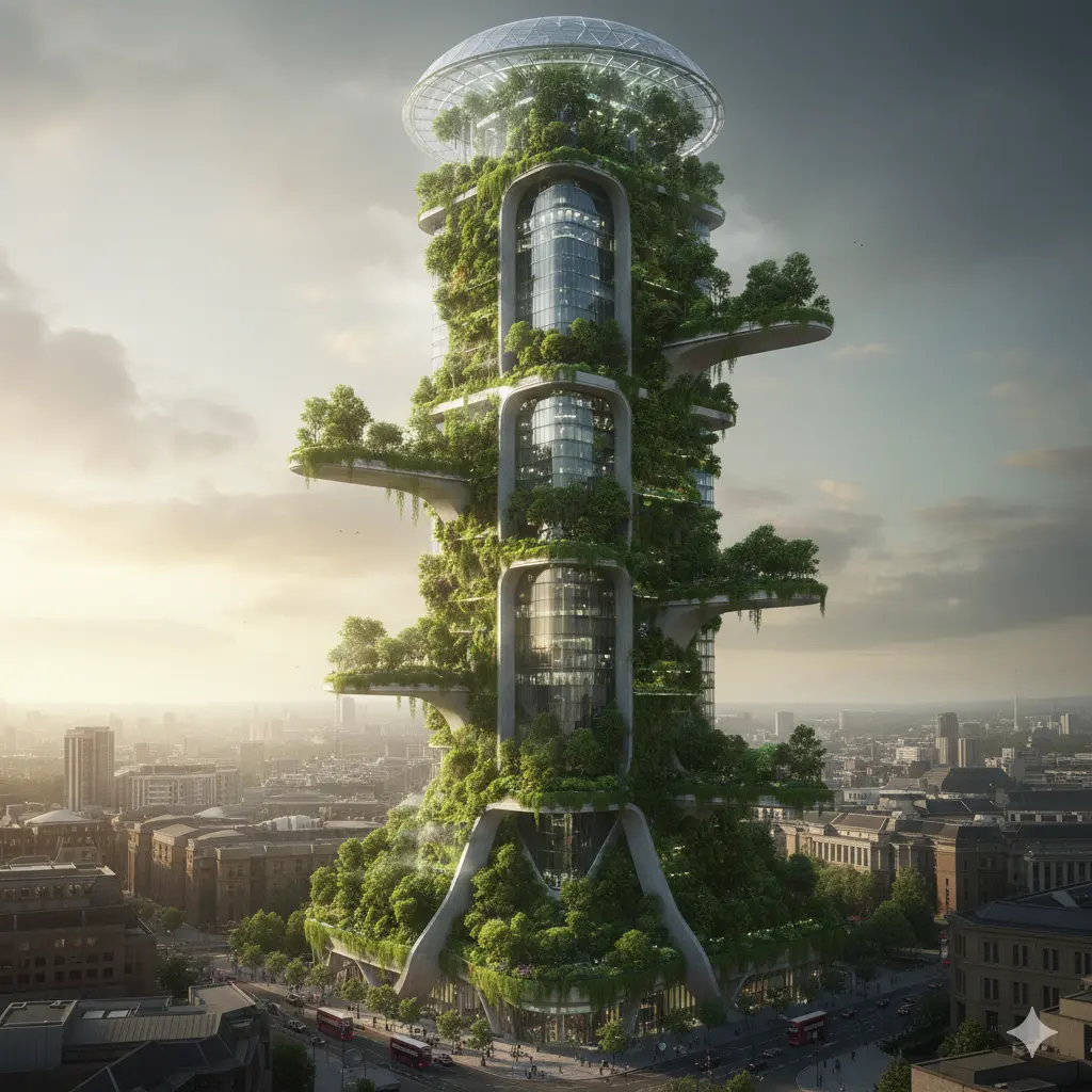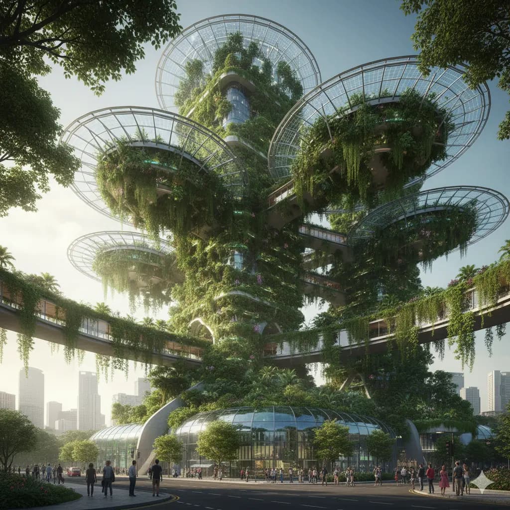 Every structure is engineered to absorb more CO2 than it produces, turning buildings into active carbon sinks.